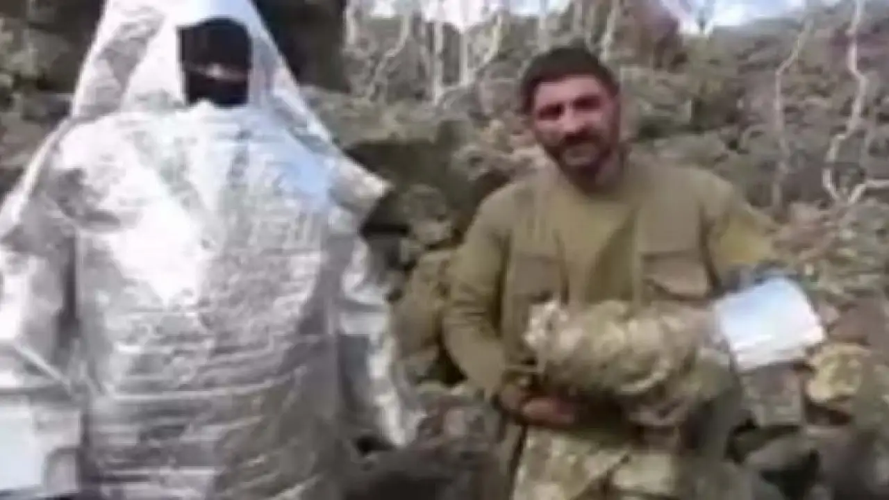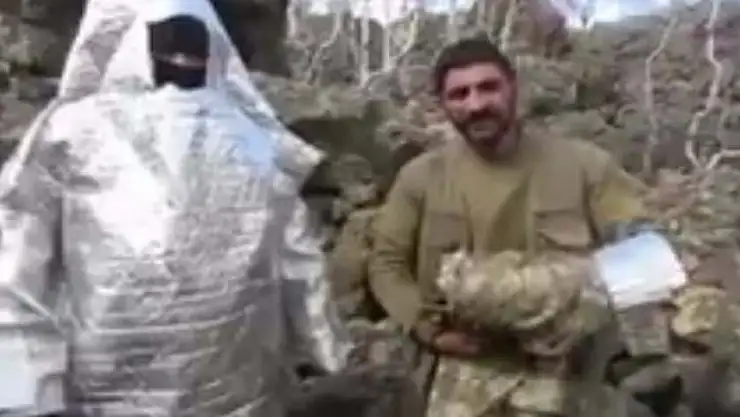 Ağar paylaştığı videoya “Operasyonlarda yakalanan yüzlerce m2'lik alüminyum folyonun nedeni: PKK'nın termal tespite karşı geliştirmeye çalıştığı taktik. Sonuç: YPG'li, DSG'li PKK'lıdan sonra UZAYLI PKK'lı... Elinde M-16'sı ile.” notunu düştü.