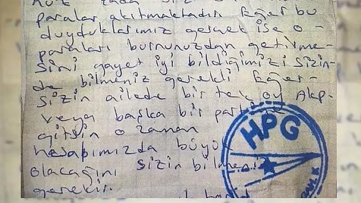 PKK'nın silahlı kanadı HPG, vatandaşlara mektup göndererek, "Eğer sizin ailede bir tek oy AKP veya başka bir partiye gitsin o zaman hesabımız da büyük olacağını sizin bilmeniz gerekir" tehdidinde bulundu.