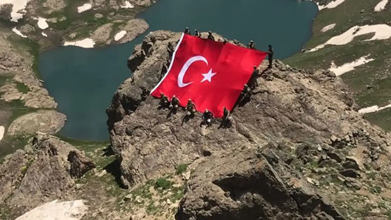 Hakkari'deki İkiyaka Dağları'nda dev Türk bayrağı açan Mehmetçik, namaz kılıp İstiklal Marşı okudu.