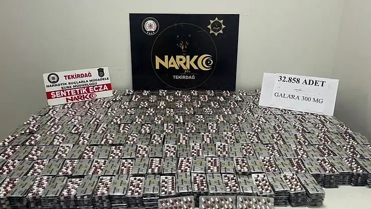 Tekirdağ İl Emniyet Müdürlüğü Narkotik Suçlarla Mücadele Şube Müdürlüğü görevlilerince Süleymanpaşa ilçesi Zafer Mahallesinde B.Y. isimli şahsın ikametinde arama yapıldı. Yapılan aramada, 2 bin 347 plaster halinde toplam 32 bin 858 adet sentetik ecza hap ele geçirildi.