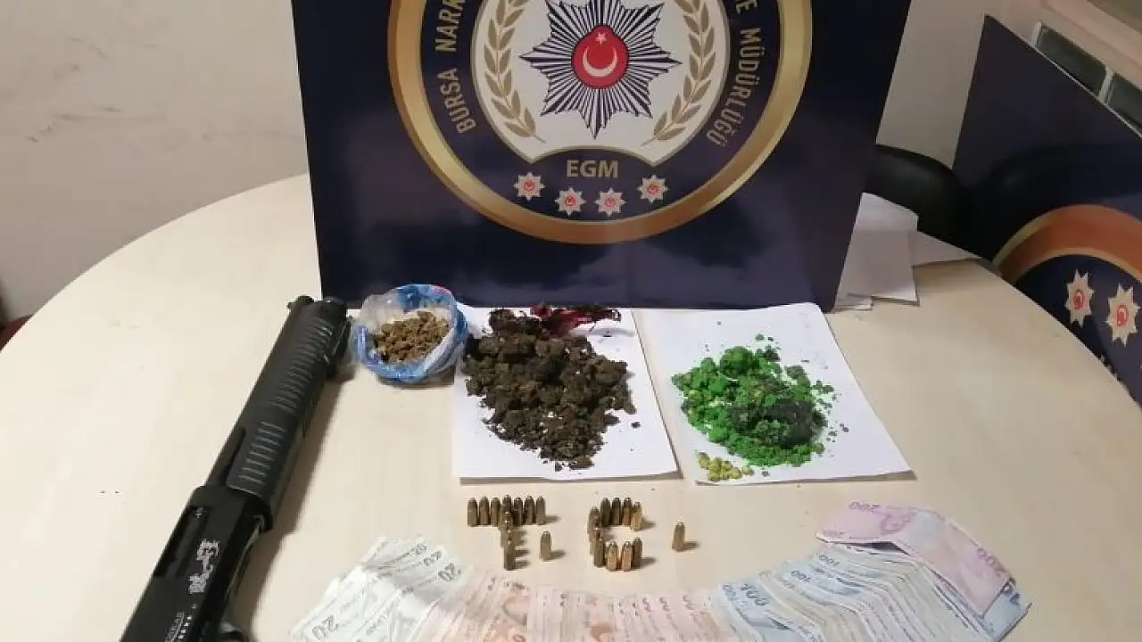 Bursa Narkotik Suçlarla Mücadele Şube Müdürlüğü ekipleri, uyuşturucu madde kullandıkları tespit edilen 3 kişiyi gözaltına aldı. Şahısların ifadelerine başvuran polis, uyuşturucuyu kimden aldıklarını öğrendi. İfadelerin ardından takibe başlayan ekipler, 11 şahsın kimlik bilgilerine ulaştı. Narkotik polisi, T.K, U.Ç, H.Ç, R.B, Y.E.A, B.T, M.Ş, K.K, G.G, Y.A. ile yaşı küçük Y.G. isimli 11 şahsa yönelik operasyon düzenledi. Polisi karşılarında gören şüpheliler ellerindeki uyuşturucu maddeyi sobaya atarak yakmaya çalıştı. Narkotik polisi şahıslara ait ev ve iş yerlerinde arama yaptı. Aramalarda 30 gram toz ecstasy, 37 tablet ecstasy, 210 gram esrar, 100 gram sentetik kannobinoid, uyuşturucu ticaretinden elde edildiği tahmin edilen 7 bin 900 lira, bir adet ruhsatsız tabanca, bir adet ruhsatsız af tüfeği ve bu silahlara ait fişekler ele geçirildi.