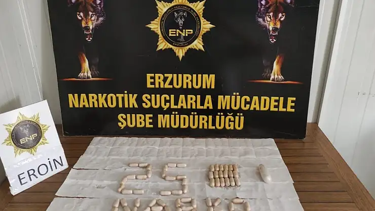 İl Emniyet Müdürlüğü Narkotik Suçlarla Mücadele Şube Müdürlüğü ekipleri, Erzincan- Erzurum yolunda aracı durdurdu. Polis, İran'dan Türkiye'ye giriş yapan araçtaki 2 kişiden şüphelenince muayene için hastaneye götürdü ve röntgen çekildi. İran uyruklu kişilerin midesinde kapsüller olduğu görüldü. Hastanede yapılan işlem sonrası 2 şüphelinin midesinden 64 kapsül halinde 558,83 gram eroin çıkarıldı. Emniyetteki sorguları tamamlanan Ali F. ile Saman G., sevk edildiği adliyede çıkarıldığı hakimlikçe tutuklandı.