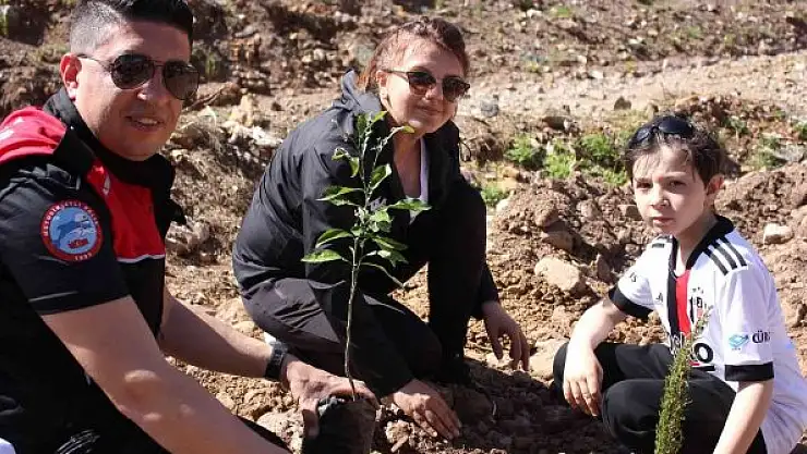 Polisler aileleri ile yanan alanlara fidan diktiler