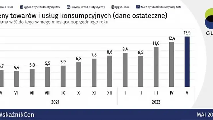 Polonya Devlet İstatistik Kurumu (GUS), Polonya'da mayıs ayında enflasyon oranının yüzde 13,9'a ulaştığını açıklarken, ülkedeki enflasyon oranı 1998 yılından bu yana en yüksek seviyeye ulaştı.