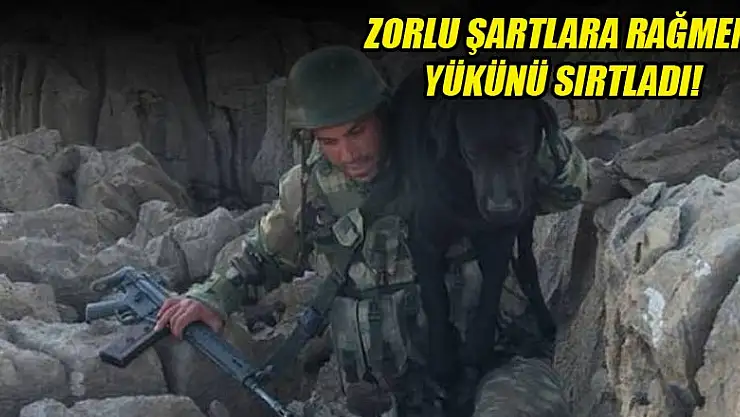 'Postal parçalayan ayalık' olarak bilinen Balkayalar'da çekilen fotoğrafta bir komando sırtına bomba imha köpeğini alarak tırmanışına devam ediyor.