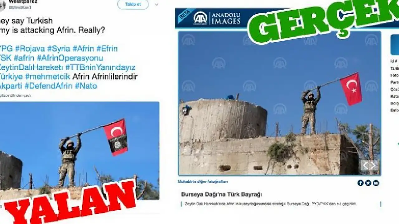 Terör örgütü PYD/PKK'ya yakın sosyal medya hesapları, Türk Silahlı Kuvvetlerinin (TSK) Afrin'de yürüttüğü Zeytin Dalı Harekatı'nın simgesi haline dönüşen AA'nın Burseya Dağı'nda çektiği Türk bayraklı asker fotoğrafı üzerinden kara propaganda yapmaya çalıştı.