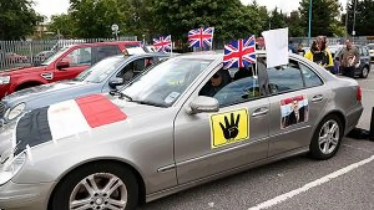 Başkentin kuzeydoğusundaki Cricklewood mahallesinde bir alışveriş merkezinin otoparkında bir araya gelen grup, burada araçlarını İngiliz, Mısır ve Rabia bayraklarıyla donatırken, otomobillerinin kaputları ile kapılarının üzerine yine Mısır bayrağı, Rabia işareti ve Mısır'ın darbeyle görevinden uzaklaştırılan seçilmiş ilk Cumhurbaşkanı Muhammed Mursi'nin fotoğraflarını astı.