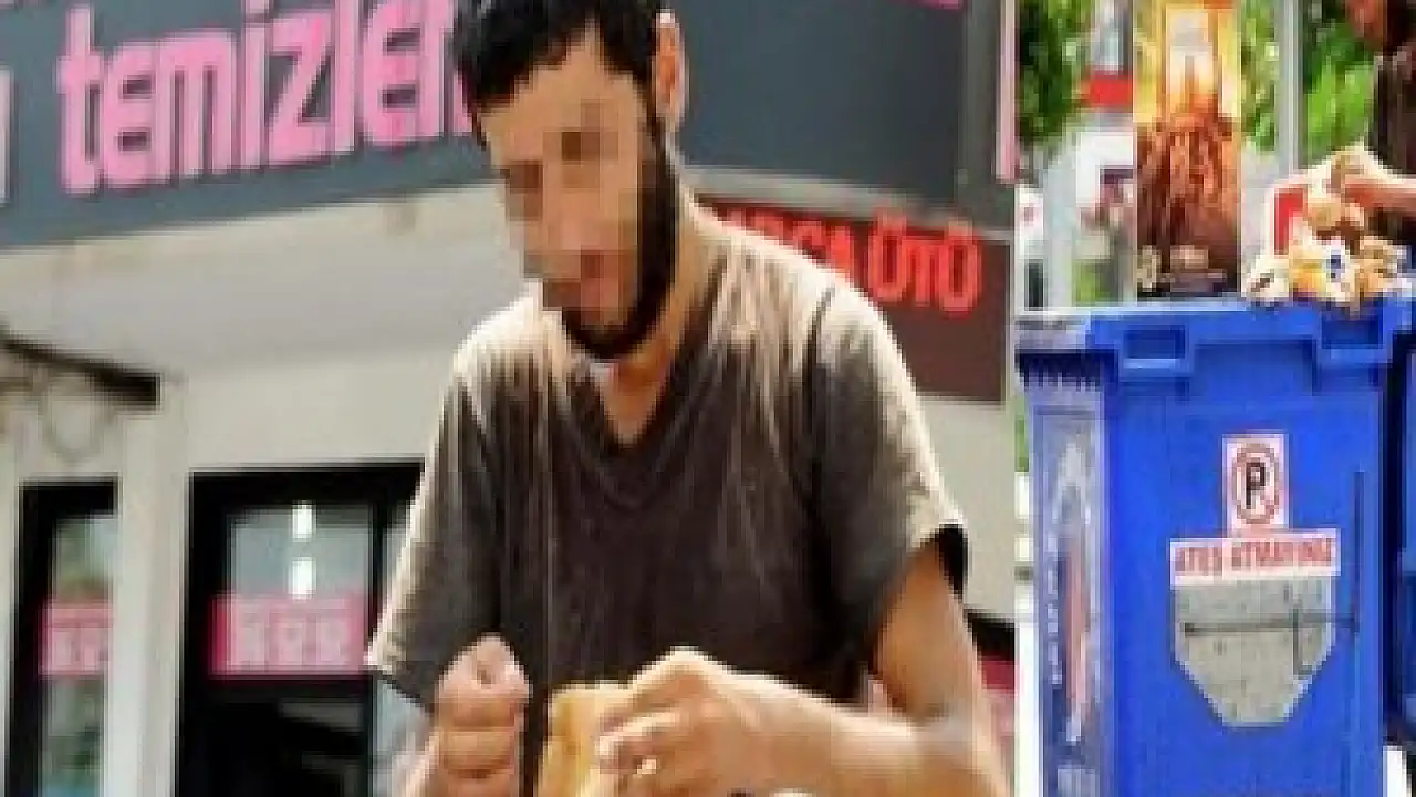 Antalya'nın Muratpaşa İlçesi'nde çöplerikarıştıran bir kişi, Burhanettin Onat Caddesi'ndeki konteynırda ekmek, pide vesimit parçası buldu. Ayağında terlik, eşofmanının paçasını kıvırarak şorta dönüştüren ve güneşin kavurucu sıcağından rengi solmuş tişörtüyle çöpleri