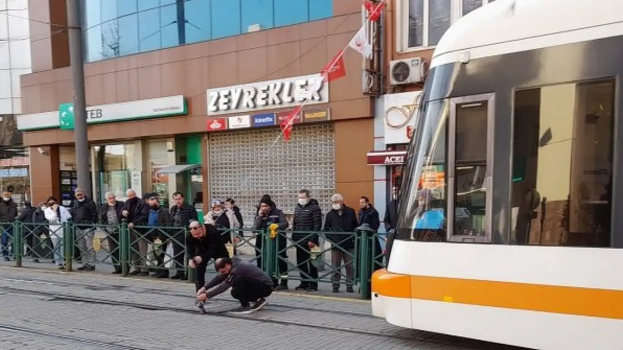 Raylara sıkışan güvercin tramvay seferlerini aksattı