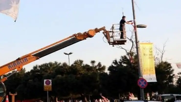 Görevliler, sopalara monte edilmiş bıçaklarla afiş ve pankartları tutan ipleri kesip toplarken, daha yüksek yerlerdeki materyallar ise vinçler yardımıyla alındı. Pankart ve afişlerin toplanması işlemleri, gece yarısına kadar devam edecek.