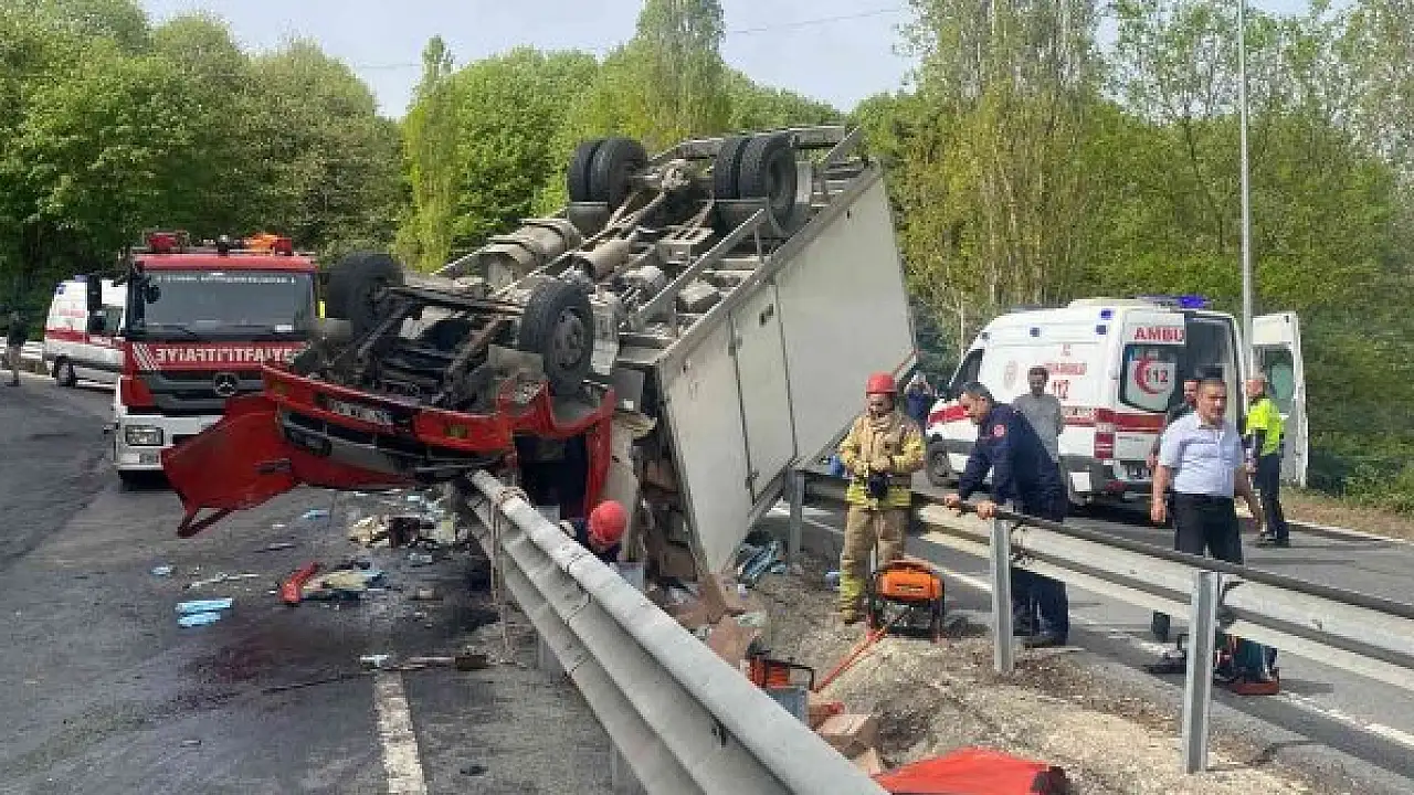 Sarıyer'de marketlere gıda taşıyan kamyonet, sürücüsünün kontrolünden çıkınca refüje çarparak ters döndü. Refüjde ters dönen kamyonetteki 3 kişi ağır yaralandı.