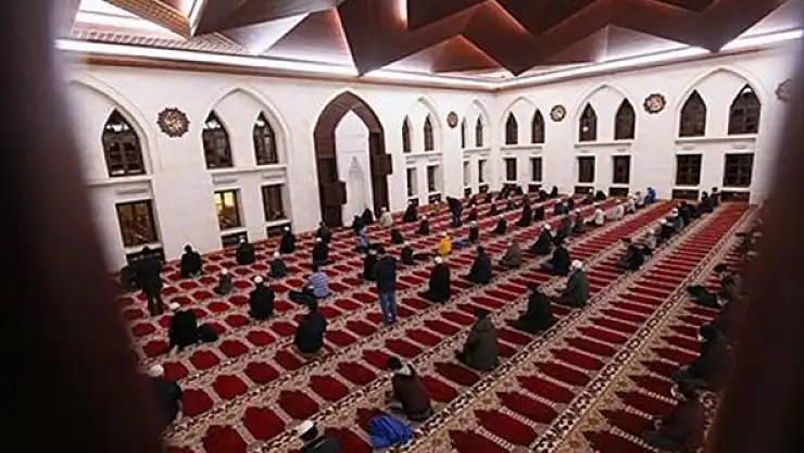 Yeni tip koronavirüs (Kovid-19) tedbirleri kapsamında maske, mesafe ve hijyen kurallarının gözetildiği camide, vatandaşlar dua edip namaz kıldı.