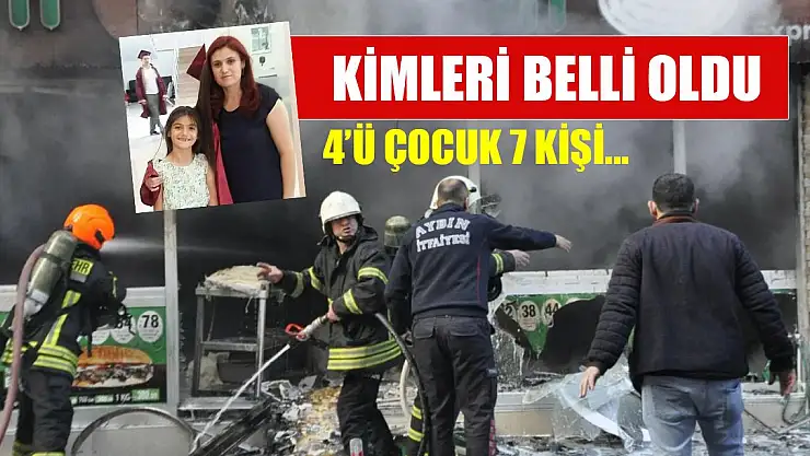 AYDIN'ın Nazilli ilçesinde bir döner firmasına ait restoranın mutfak bölümünde tüp değişimi sırasında meydana gelen patlamada hayatını kaybeden 7 kişinin kimlikleri belli oldu. Ölenlerin Fatma Danaş (45), Neslihan Karaboğa (38) çocukları Lale Nur Karaboğa (11), Gamze Karaboğa (10) ve Cansu Karaboğa (4) ile Emine Düztepe (37) ve kızı İrem Düztepe (14) olduğu belirtildi.