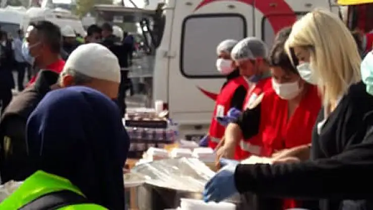 Ege Denizi'nde merkez üssü İzmir'in Seferihisar ilçesi açıkları olan depremde yaralar sarılmaya devam ediyor. Konya merkezli Ribat Eğitim Vakfı da yıkılan Emrah Apartmanı enkazında sıcak yemek ikramlarında bulundu.