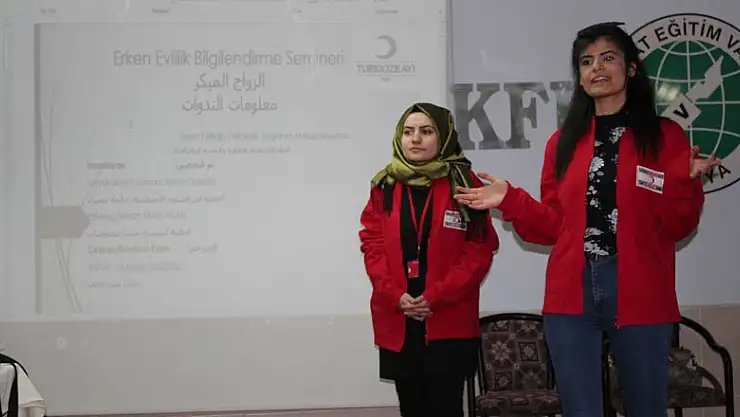Erken yaşta evliliğin anlatıldığı seminere Psikolog Melda Kimyonsan ve Sosyal Hizmet Uzmanı Saime Demirel konuşmacı olarak katıldı.