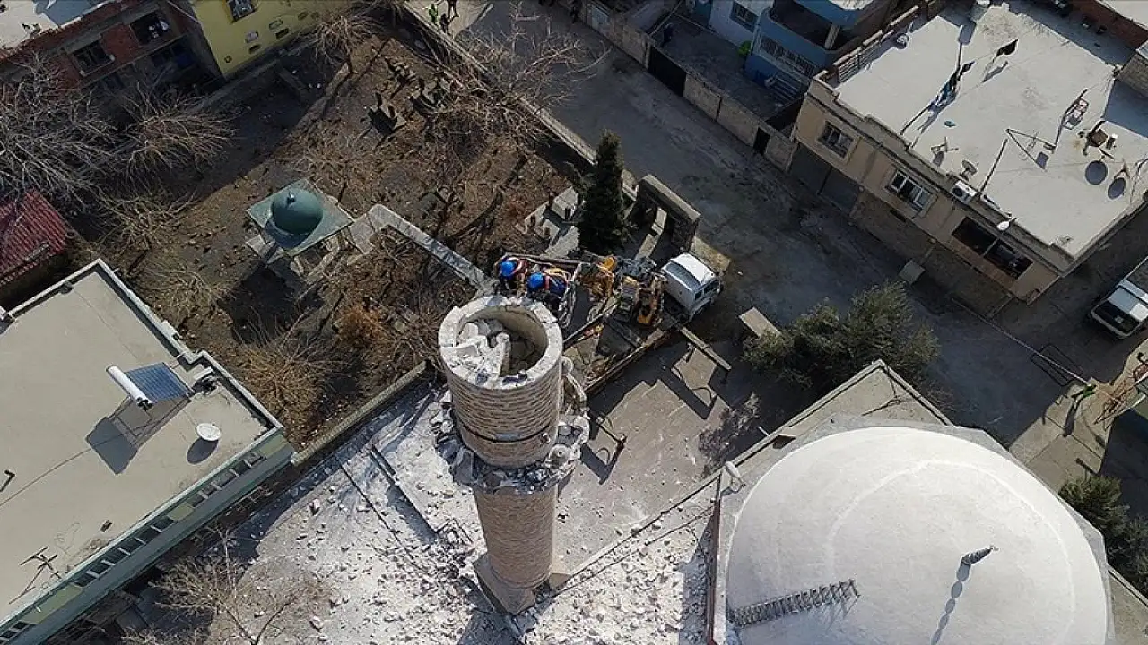 Kahramanmaraş merkezli depremlerden etkilenen Şanlıurfa'nın Siverek ilçesinde hasar gören caminin minaresi kontrollü olarak yıkıldı.