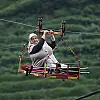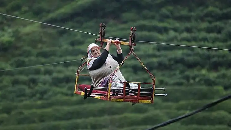 Rize'nin Muradiye beldesinde kuma olan ve rahatsızlıkları nedeniyle yürüyemeyen iki kadın, patika yolu kullanamadıkları için 150 metre uzunluğundaki ilkel teleferik ile ulaşımlarını sağlıyor.