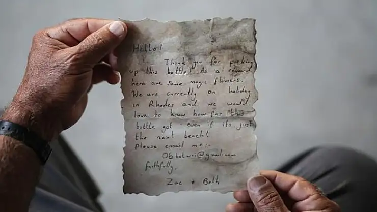 Yunanistan'ın Rodos adasında tatillerini geçiren iki kişinin cam şişe içinde denize attıkları mektup Gazzesahillerinde bir balıkçı tarafından bulundu.