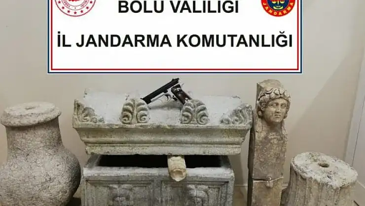 Bolu'da, jandarmanın operasyonuyla Roma dönemine ait lahit, heykel, 2 sütun kaide ve tabanca ele geçirilirken, 1 kişi de gözaltına alındı.