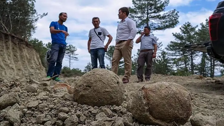 Kütahya'nın Domaniç ilçesinde, ormanda yürütülen yol çalışmaları sırasında Roma dönemine ait yüzlerce taş gülle bulundu.
