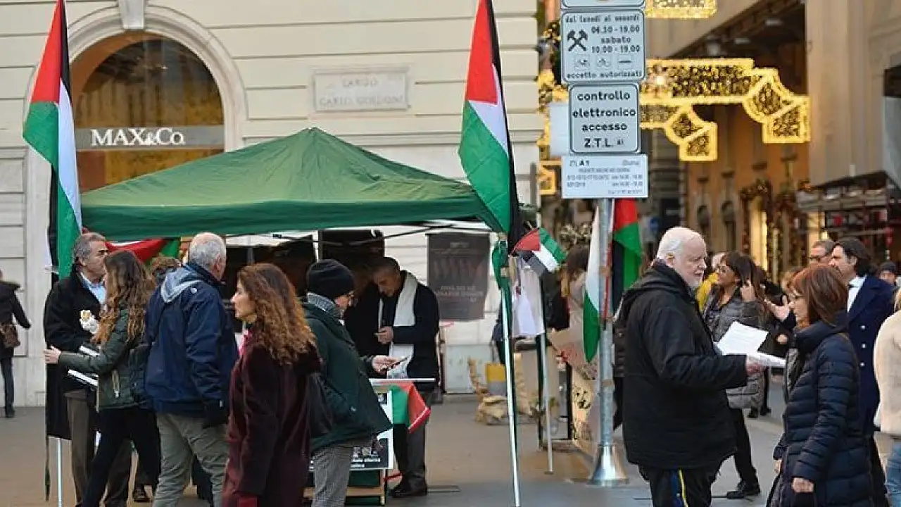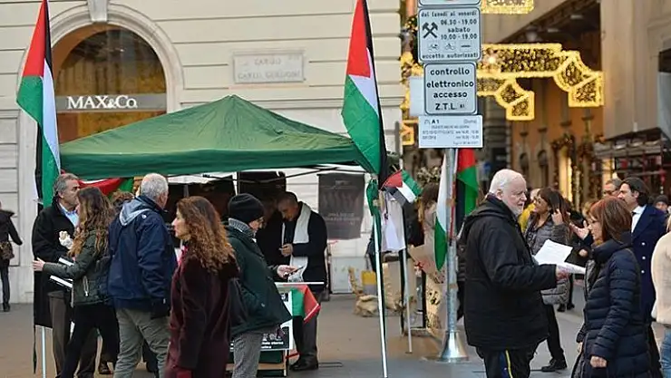 Roma ve Lazio'daki Filistinliler Topluluğu, Roma'nın en işlek caddelerinden birinde stant açarak iki gün boyunca vatandaşları Filistin ve Kudüs'le ilgili son gelişmeler hakkında bilgilendirdi.