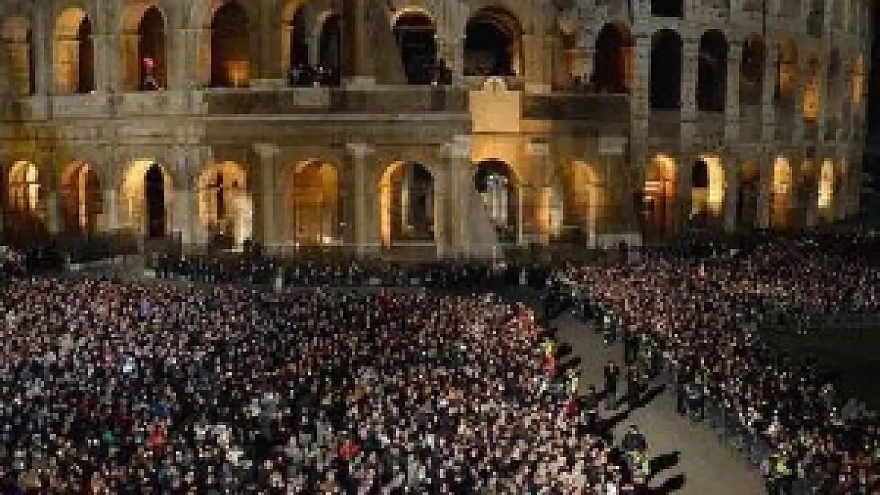 Roma'nın tarihi simgelerinden birinin önünde yapılan ayini, farklı milletlerden binlerce kişi takip ederken, Avrupa’da son dönem yaşanan terör olayları nedeniyle bu yılki katılımın önceki yıllara göre düşük olduğu gözlendi. Etkinlik öncesi Kolezyum ve çevresinde yoğun güvenlik önlemleri gözlenirken, ayine katılanlar üç ayrı sıkı aramadan geçirilerek alana alındı.