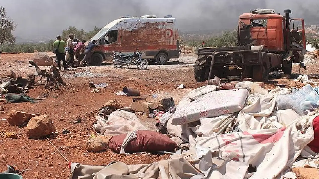 Suriye'deki sivil savunma yetkililerinden alınan bilgiye göre, Rus jeti savaş nedeniyle yerlerinden olan Suriyelilerin kaldığı Etarib ilçesi yakınlarındaki Maret el Etarib Sığınmacı Kampı'na misket bombasıyla saldırdı.