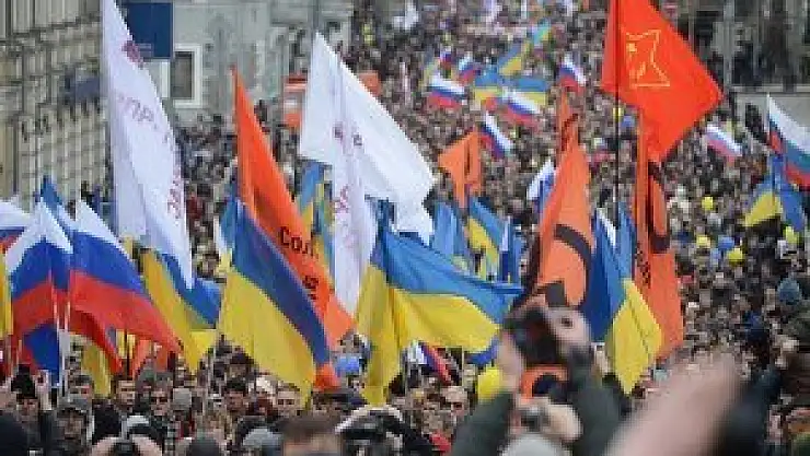 Moskova'daki Puşkin Meydanı'nda toplanan oldukça kalabalık bir grup, buradan Saharova Meydanı'na kadar yürüdü. Grup üyeleri burada, Rusya ve Ukrayna bayrakları açtı. Rusya muhalefetinin organize ettiği mitingde, Kırım'da yarın yapılacak referandum ve Kırım'ın Rusya'ya bağlanma talebi protesto edilerek, Ukrayna'nın toprak bütünlüğü desteklendi.