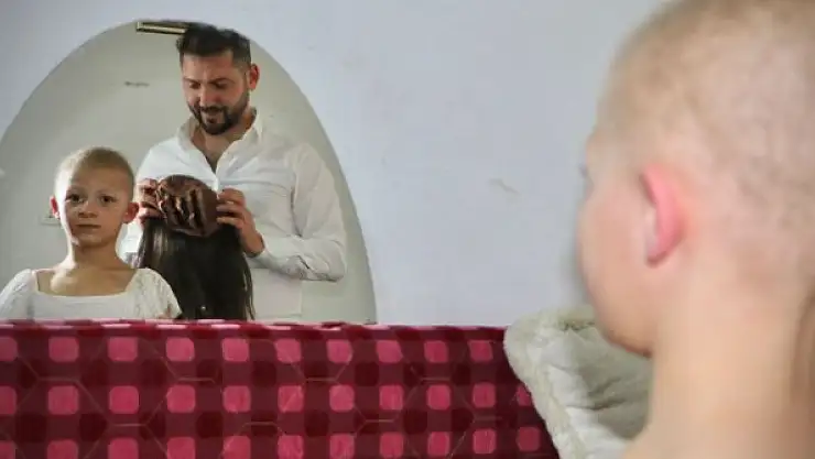 ANKARA'da 7 yıllık kadın kuaförü Yasin Kirazlı (28), kanser ve çeşitli rahatsızlıklar nedeniyle saçı olmayan kız çocuklarına, vatandaşların bağışladığı saçlardan ücretsiz olarak peruk yapıyor.