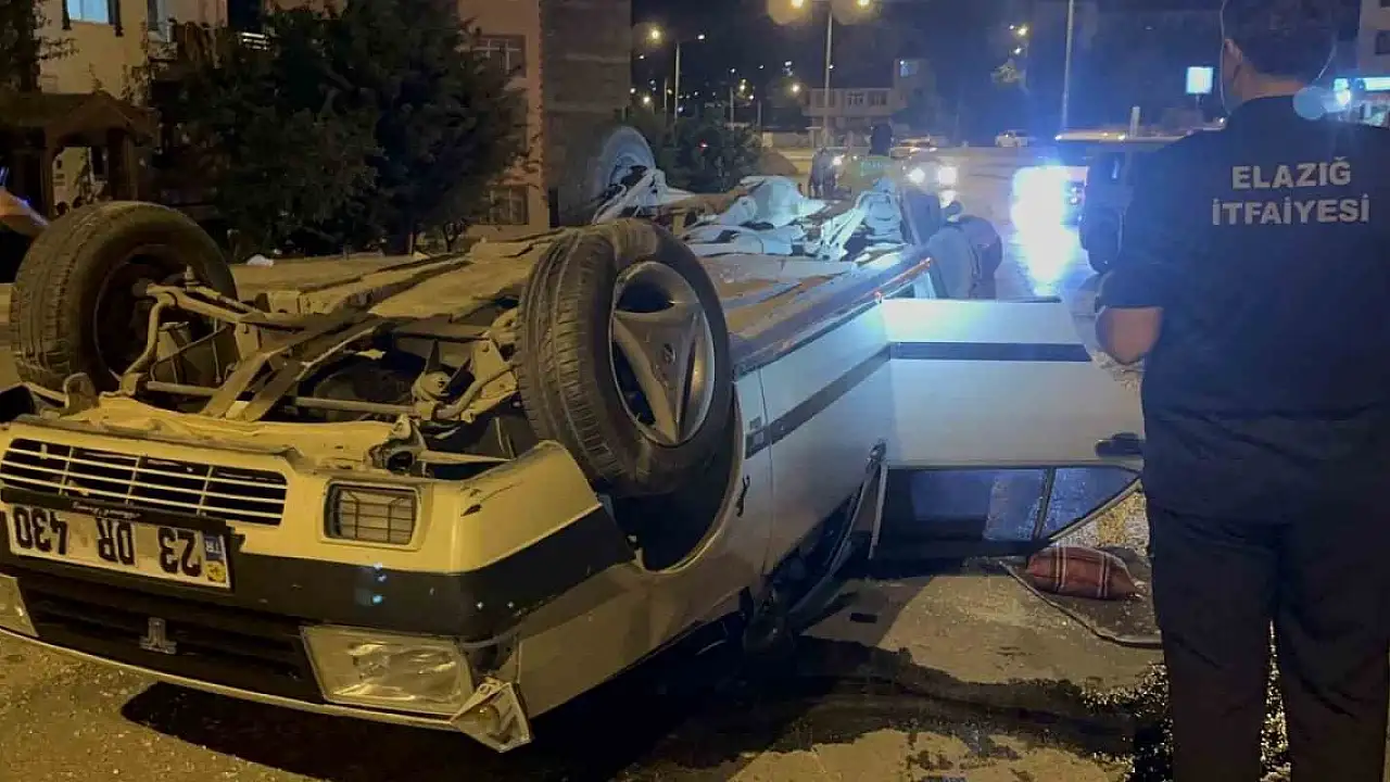 Elazığ'da kontrolden çıkan otomobil kaldırıma çarptıktan sonra tekeri koptu, ardından karşı şeride uçtu. Takla atarak ters dönen araçta bulunan 4 kişi kazayı yara almadan atlattı.