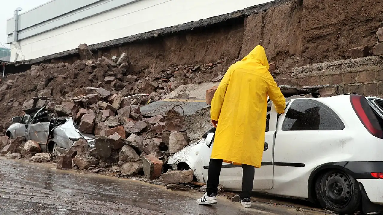 KAYSERİ'de sağanak nedeniyle bir iş yerinin istinat duvarı çöktü. Park halindeki 3 araç, çöken duvarın altında kalarak, kullanılamaz hale geldi.