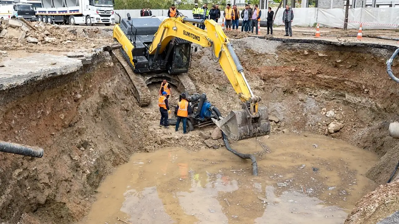 Trafiğe kapatılan yolda aracın çıkarılması için çalışmalara sabah saatlerinde tekrar başlayan Ankara Büyükşehir Belediyesi ekipleri, 15 metre derinlikteki çukurda bulunan suyu pompalarla tahliye etti.