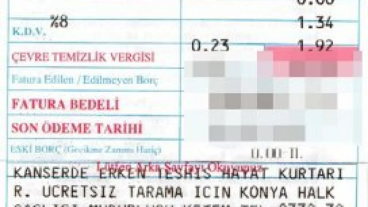 Konya Halk Sağlığı Müdürlüğü ve KOSKİ Genel Müdürlüğü ile birlikte yapılan organizasyon kapsamında su faturalarında vatandaşları 'Kanserde erken teşhis hayat kurtarır' mesajıyla uyarıyor.