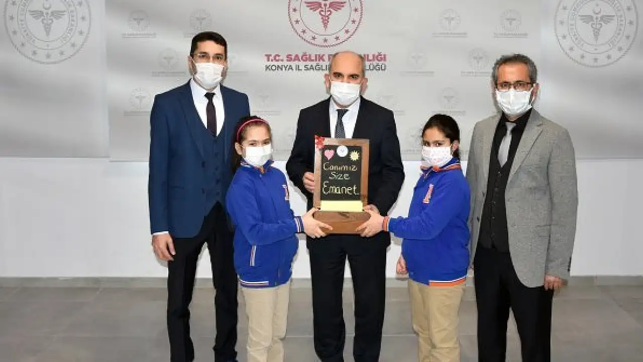 Konya Alaeddin İlkokulu öğrencileri, 'Yüreğimiz sizinle' projesi kapsamında yazdıkları mektupları, sağlık çalışanlarına ulaştırmak üzere İl Sağlık Müdürü Prof. Dr. Mehmet Koç'a teslim ettiler.