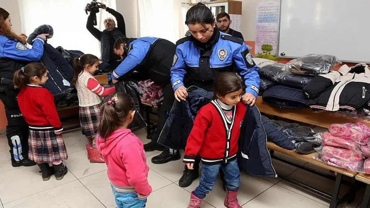 Paltoları giyen minik öğrenciler de Gökbakar ve polis amcalarına teşekkür etti.
