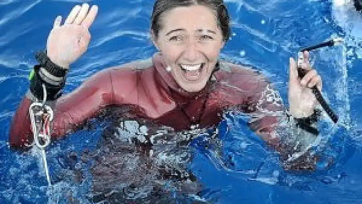 Milli sporcu Şahika Ercümen, Kaş'ta "paletsiz ip destekli serbest dalış" alanında 72 metre derinliğe inerek ikinci dünya rekorunu kırdı.