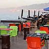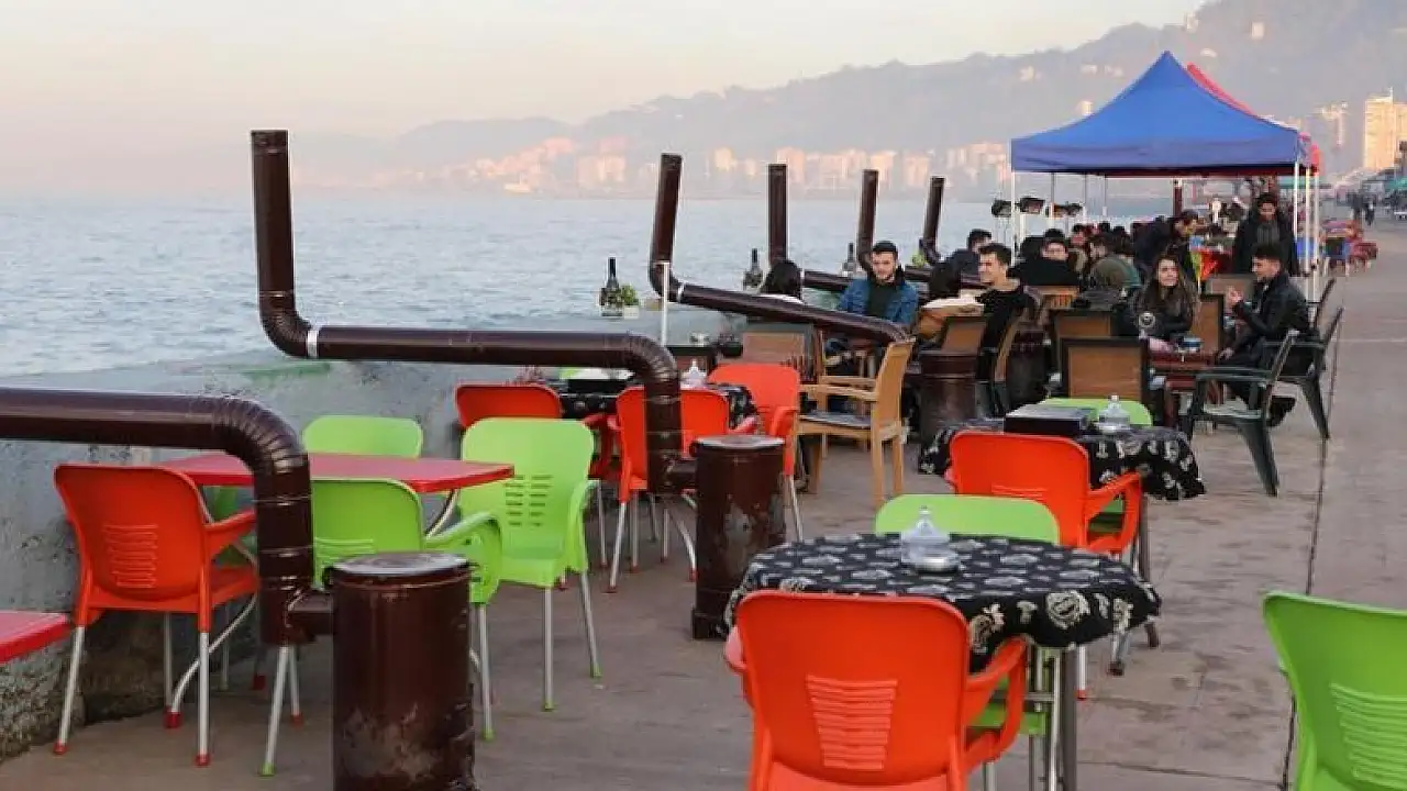 Rize sahil kesiminde açık alanda hizmet veren işletmecilerin, müşterilerinin ısınması için masaların arasına kurdukları sobalar görenlerin ilgisini çekiyor.