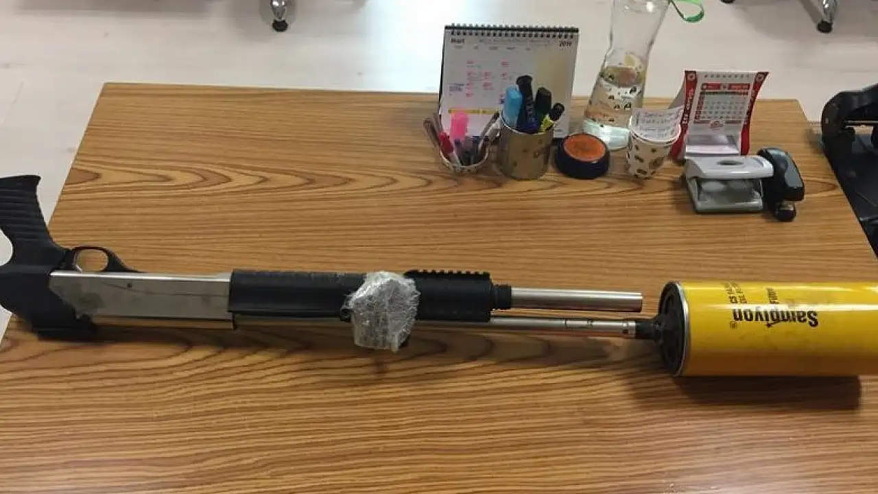 Şüpheli M.A'nın ikametinde arama yapan ekipler, bez çanta içerisinde siyah poşette, üzerinde kamyonlarda kullanılan yağ filtresinin üst kısmında somunla kaynak yapılmış susturucu ve alev gizleyen olarak kullanılan düzenek bulunan tüfeği ele geçirdi.