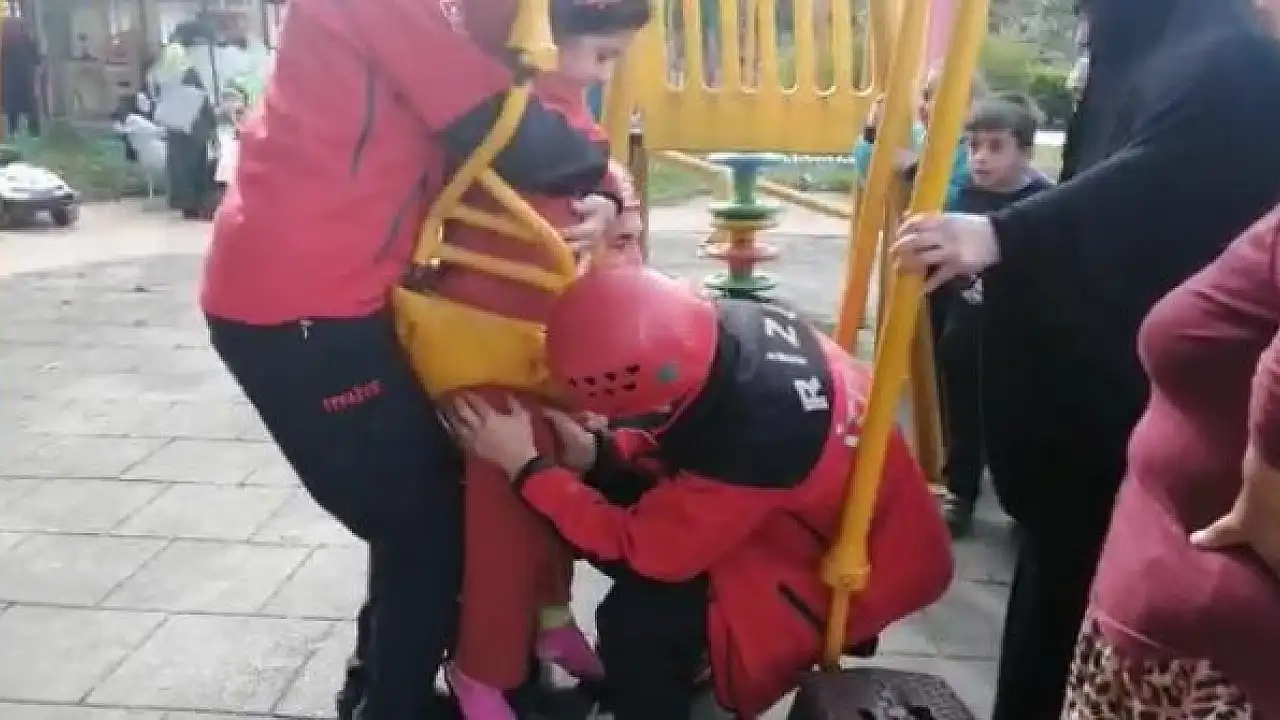 RİZE'de ailesiyle parka giden 6 yaşındaki kız çocuğu, salıncağa sıkıştı. Çocuk, itfaiye ekiplerinin çalışmasıyla kurtarıldı.