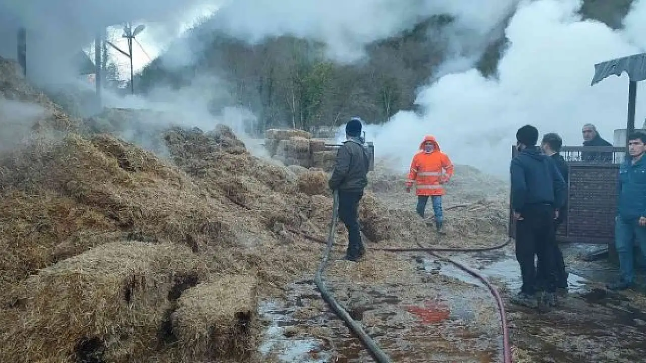 Bartın'ın Ulus ilçesinde özel bir şirkete ait olan hayvan besi çiftliğinde altı bin adet saman balyası deposunda yangın çıktı.