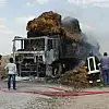 Ereğli'de elektrik direklerine çarptığı iddia edilen saman balyası yüklü TIR, çıkan yangın sonrası kullanılamaz hale geldi.