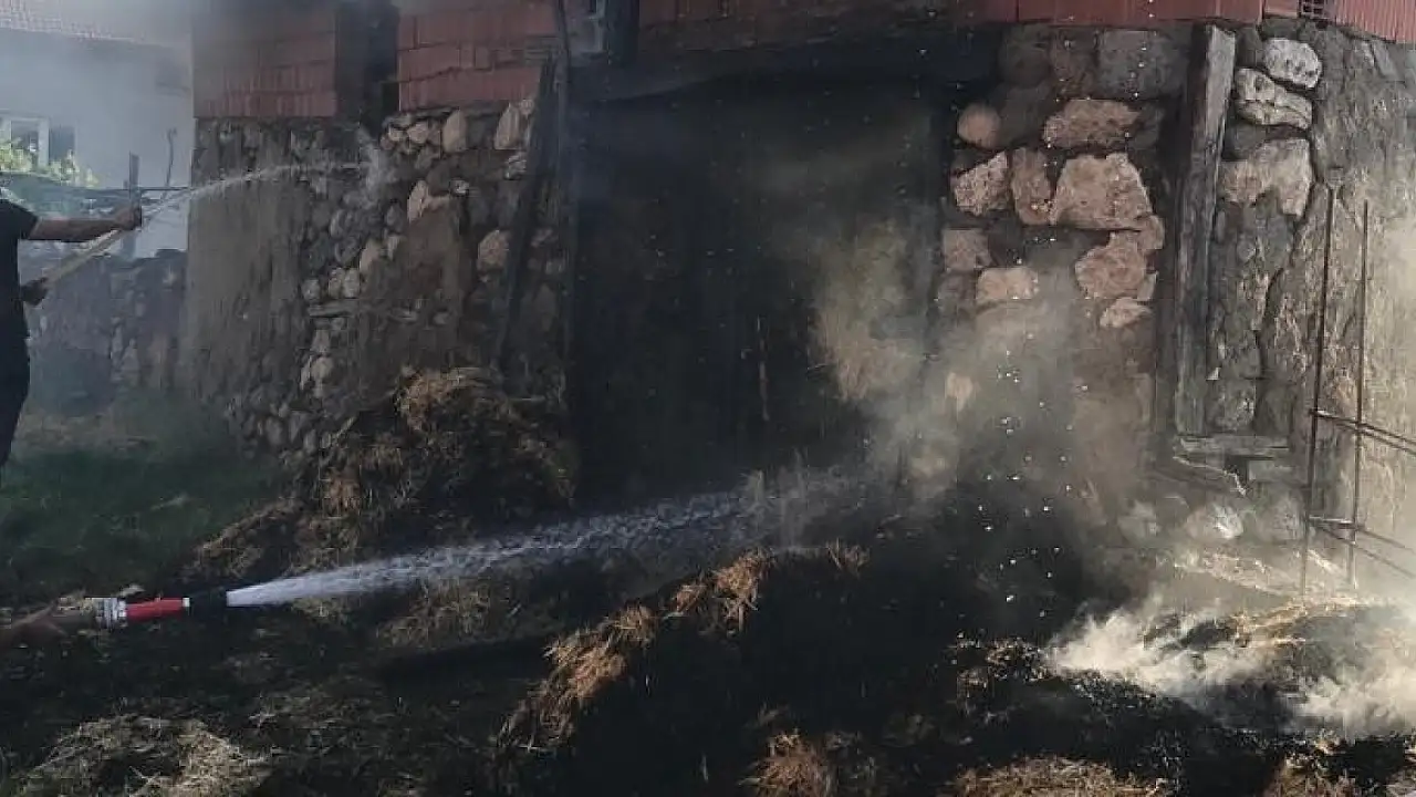 Afyonkarahisar'da samanlığın çatısında çıkan yangınının içeriye sıçraması sonucu onlarca saman balyası kül oldu.