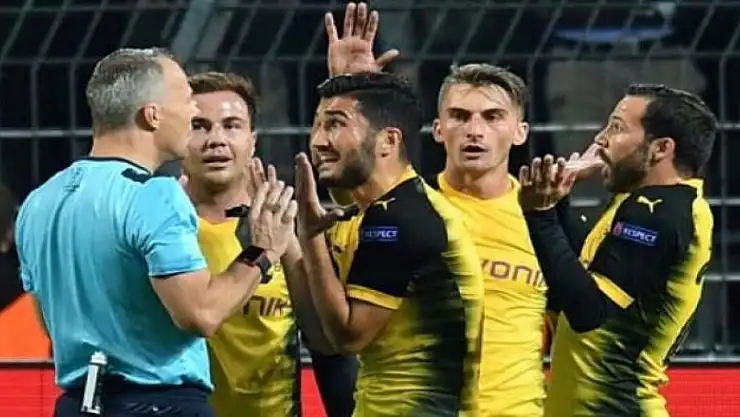 Penaltıları güme giden Borussia Dortmundlu oyuncular, Nuri Şahin önderliğinde Hollandalı hakemin etrafını sararak yoğun itiraz etseler de karar değişmedi.