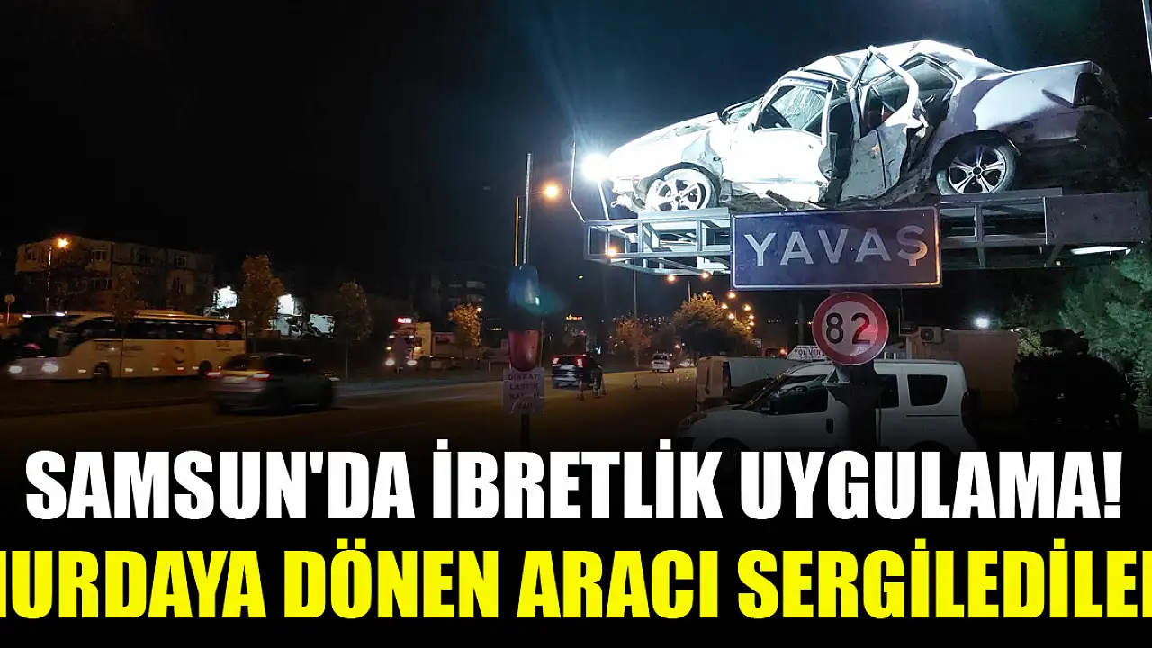Samsun'da trafik polisleri, kaza yaparak hurdaya dönen aracı şehir girişinde oluşturdukları platformda sergileyerek sürücülere hız sınırına karşı ibretlik uyarıda bulundu.