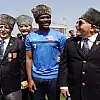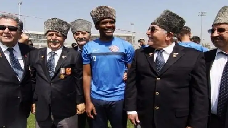 Antalyasporlu Samuel Eto'o, kalpak takıp antrenmanı izleyen gazilerle fotoğraf çektirdi.
