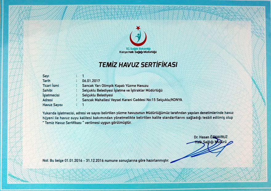 Konya genelindeki tüm havuzlarda yapılan denetimler sonucunda Selçuklu Belediyesi’ne ait Sancak Yarı Olimpik Yüzme Havuzu’nun bir yıl boyunca havuz hijyeni ve su kalitesi bakımından yönetmeliklerde belirtilen standartları sağladığı tespit edildi. Selçuklu Belediyesi tarafından yürütülen çalışmalar sonucunda fiziki şartlar, kullanılan kimyasallar ve suyun kalitesi titizlikle takip edildi. Havuzda her gün en az 8 ölçüm yapılarak havuz kullanım kuralları titizlikle uygulandı. Kaliteli havuz suyunun oluşturulması için sarf edilen çabalar ile bir yıl boyunca hiçbir uyarı ve kapatma cezası almayan Sancak Yüzme Havuzu temiz havuz sertifikası almaya hak kazandı.