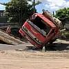 Sancaktepe'de kum yüklü kamyon devrildi