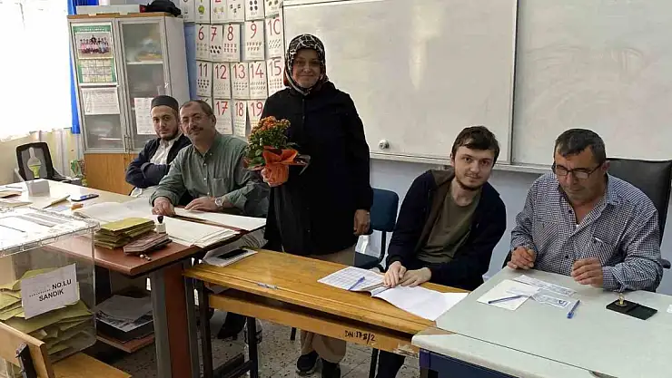 Sandık başında görevli olduğu sırada ellerinde çiçeklerle salona giren çocuklarını gören anneleri Uçar'ın anneler gününü tebrik etti.