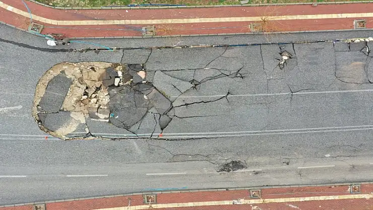 Yaklaşık 5 metre derinliğinde çukur oluşan, asfaltında da yarıklar görülen yol, çevresine güvenlik şeridi çekilerek trafiğe kapatıldı.