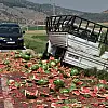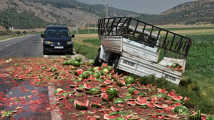 GAZİANTEP'in İslahiye ilçesinde, arka lastiğinin patlaması sonucu sürücüsünün kontrolünden çıkan kamyonetin şarampole devrildiği kazada baba- oğul yaralanırken, kasasındaki 3 ton karpuz ise çevreye saçıldı.